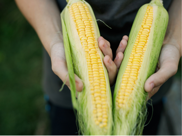 小麦、大豆、菜種、トウモロコシ、米の5種類の穀物のイラストを配置。