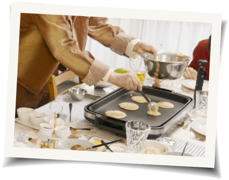小さく焼けるのでホットプレートを使って、ホットケーキやベーコンなど具材を一緒に焼いてパーティーができます。