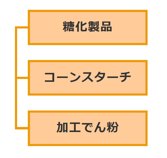 トウモロコシを原料としたコーンスターチをはじめ、ぶどう糖や異性化糖、水あめ、イソマルトオリゴ糖などの糖化製品および加工でん粉製品の製造・販売を行っています。これらの製品は、ビールや清涼飲料、菓子、パンなどの食品分野から工業分野まで幅広い用途に使用されています。