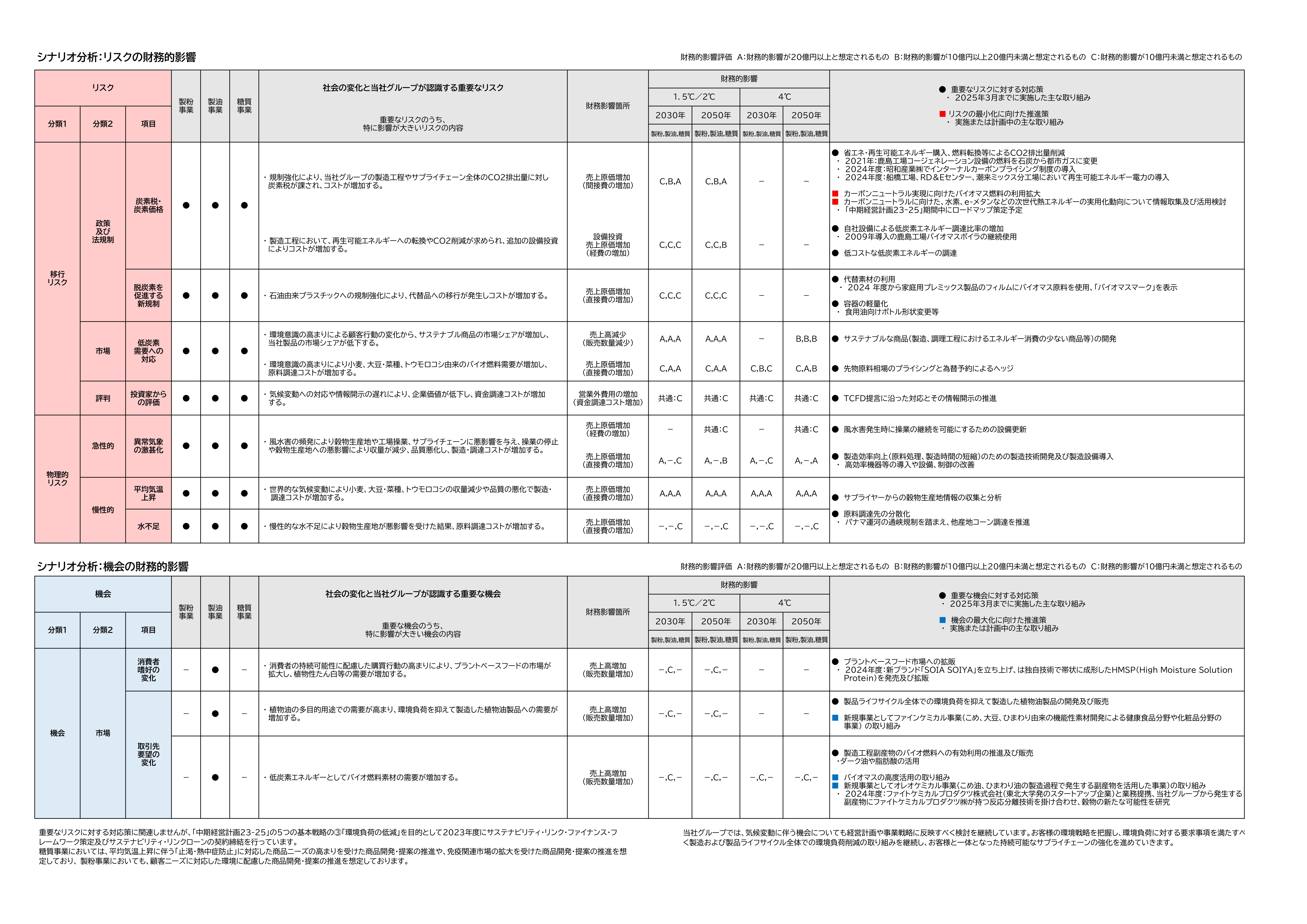 気候変動が当社グループにもたらす「リスク」と「機会」を特定し、事業に与えるインパクト(事業インパクト)をナラティブに表現。