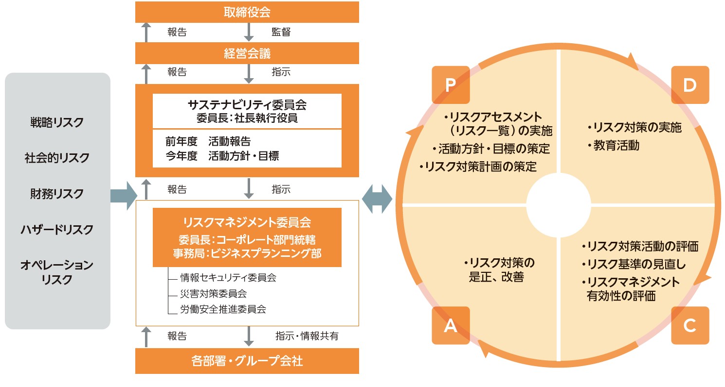 「リスクマネジメント基本方針」に基づいた取り組みの着実な実行に向け、コーポレート部門統轄を委員長とするリスクマネジメント委員会を設置しています。本委員会にて年1回、経営目標の達成を阻害する可能性のあるリスクを洗い出し、それらについて「経営の影響度」と「発生可能性」のマトリックスで構成されるリスク基準により評価を行い、リスクの重要度を決定するリスクアセスメントを行っています。