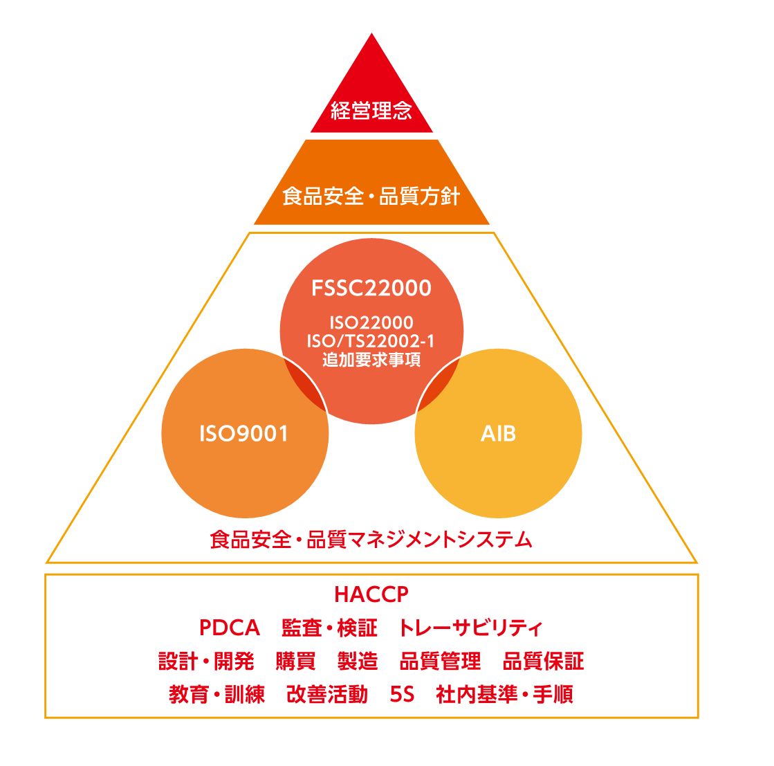 このシステムは「HACCP」を柱として「ISO22000」「FSSC22000」「ISO9001」「AIBフードセーフティーシステム」の仕組みをすべて取り入れ、効率的な運用ができるよう当社独自に再構築したものです。