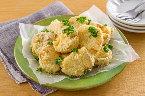 フライパンにオレインリッチ(またはサラダ油)を2cm高さまで入れて170℃で熱する。【1】のじゃがいもを【2】にくぐらせ、揚げ色がつくまで5~10分揚げる。