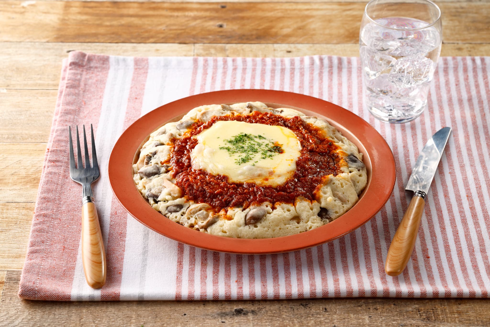 ふわふわ食感のパン(パオ)でエビチリを挟んだ、エビチリカーパオに見立てた中華風お好みーるです。ふわふわ食感の生地と、エビチリソースが相性良く、ガッツリ食べたい日にぴったりのワンプレートです。